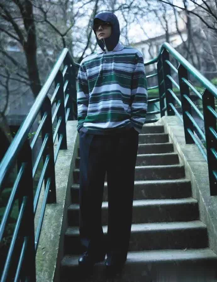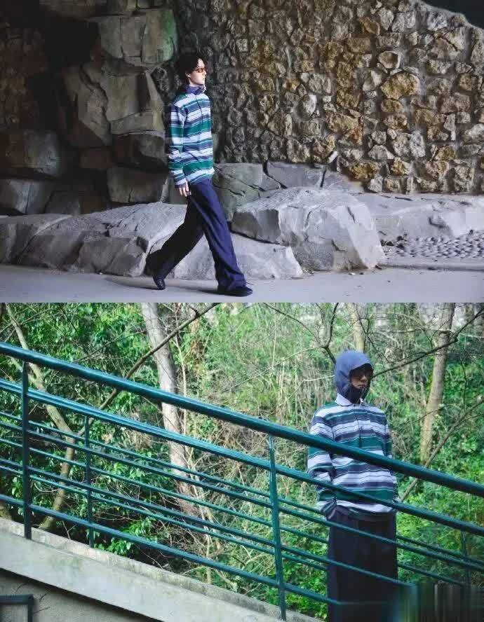 这套秀场造型的精髓,正在于这份 “化繁为简” 的高级感。经典的条纹衫是品牌标志性的设计语言,清新的配色自带松弛的春日氛围,利落的剪裁没有多余的装饰,却完美适配了他清瘦挺拔的身形,既守住了品牌百年的经典质感,又被他穿出了独有的少年清冽感。